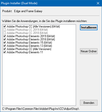 Wenn Sie eine neue Version von Photoshop Elements installieren und Edge & Frame Galaxy bereits installiert ist, müssen Sie nicht mehr das komplette Installationsprozedere von Edge & Frame Galaxy durchführen. Sie können Plugin Installer vom Startmenü aus starten und es verwenden, um Edge & Frame Galaxy in die neue Version von Photoshop Elements zu installieren.