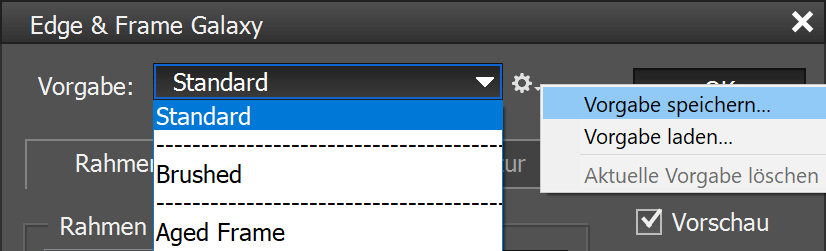 Der Menüpunkt Vorgabe speichern speichert die aktuellen Einstellungen als Vorgabedatei zur späteren Verwendung. Behalten Sie im erscheinenden Dateidialog den vorgewählten Ordner bei, um sicherzustellen, dass die neue Vorgabe im Vorgabe-Kombinationsfeld angezeigt wird. Um eine Vorgabe zu löschen, wählen Sie diese im Kombinationsfeld aus und klicken Sie dann den Menüpunkt Aktuelle Vorgabe löschen. Dadurch wird die Vorgabe aus dem Kombinationsfeld entfernt, aber auch die entsprechende Vorgabedatei gelöscht.