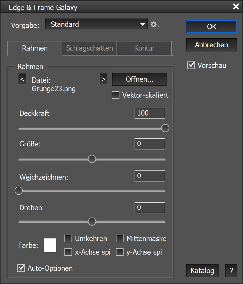 Klicken Sie auf das Farbe-Feld, um eine andere Hintergrundfarbe für den Rahmen auszuwählen. Die Standardfarbe ist Weiß. Diese Option funktioniert nicht, wenn das Kontrollkästchen Mittenmaske aktiviert ist. Die Kontrollkästchen x-/y-Achse spiegeln spiegelt den Rahmen horizontal oder vertikal. Das Kontrollkästchen Umkehren invertiert den Rahmen, sodass er in der Bildmitte und nicht an den Rändern angezeigt wird. Das Kontrollkästchen Mittenmaske verwendet eine andere Methode zum Hinzufügen des Rahmens. Dadurch können komplexere und farbigere Rahmen verwendet werden. Diese Option maskiert nur die Mitte des Rahmenbildes und lässt den Rest des Rahmens unberührt. Wenn dieses Kontrollkästchen aktiviert ist, wird die Farbe des Farbfeldes nicht mehr verwendet.