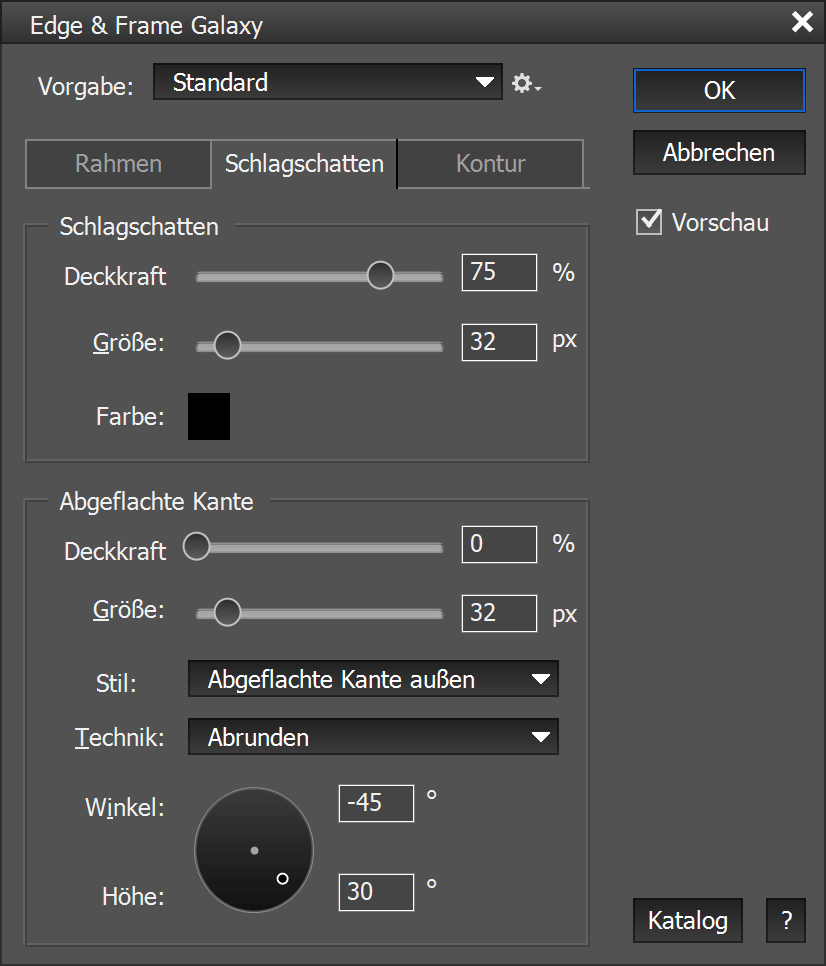Mit den Schlagschatten-Steuerelementen wird ein Schatteneffekt auf den Rahmen angewendet, der so aussieht, als würde der Rahmen über dem Hintergrund schweben. Erhöhen Sie den Regler für die Deckkraft, um den Schlagschatteneffekt besser sichtbar zu machen. Setzen Sie ihn auf Null, um den Effekt vollständig zu deaktivieren. Verwenden Sie den Größe-Regler, um den Schlagschatteneffekt zu vergrößern. Durch Klicken auf das Farbe-Feld können Sie die Farbe des Schlagschattens aus einem Farbdialog auswählen.