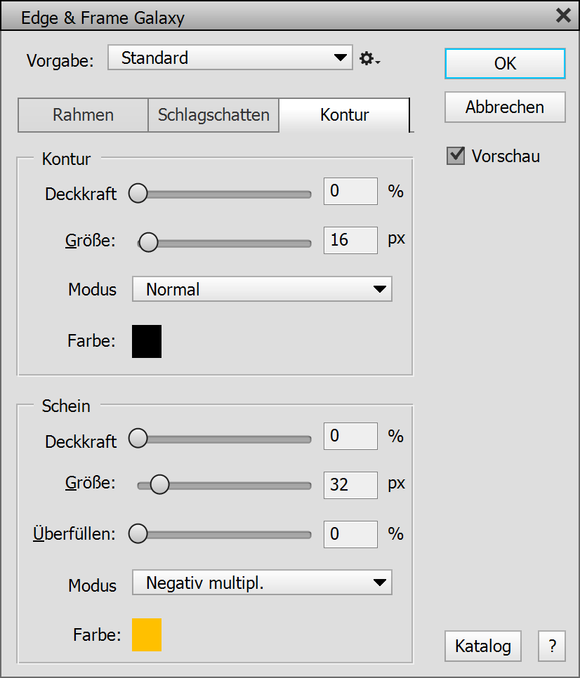 Das Dialogfeld "Edge & Frame Galaxy" bietet oben eine Vorgabe-Funktion sowie drei Registerkarten mit Optionen zum Hinzufügen eines Rahmens und zum Anwenden von Effekten.