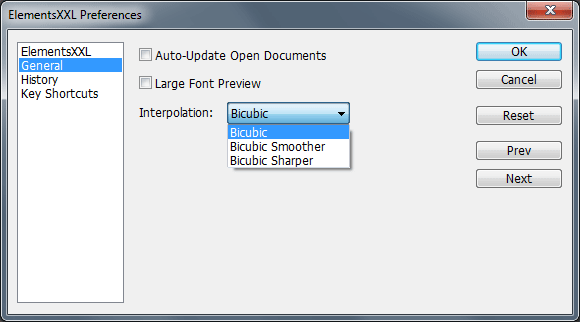 If you click on this menu item on the Preferences sub menu, a dialogue window is opened that lets you change the settings of Elements XXL. You can switch between different preferences groups by using the list on the right or by clicking the Prev and Next buttons. To set all options to the original default values click the Reset button. Press OK to apply the changes on this dialog or Cancel to discard them.