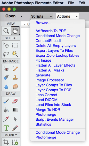 Two buttons, called Scripts and Actions, which display a menu, are added to the control bar at the left hand side.