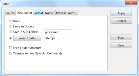 The Select Folder option lets you select another folder for saving the processed images. Click on the Select Folder button to choose one. You can activate the Keep Folder Structure check box to make sure that the sub folders of the source files are replicated in the destination folder. This is the case if you chose Select Folder and activated the Include Subfolders check box on the Source tab sheet provided that there are image files in the sub folders of the source folder. However, the Keep Folder Structure option does not work for dragged and dropped source files, even if they are from different folders. These files are always saved in the main destination folder.