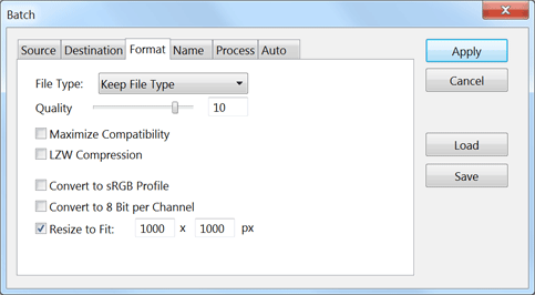 The Format tab sheet lets you keep the file format or use another one for saving the files. The File Type combo box offers a Keep File Type option, which does not change the file format of the processed files. The other options let you choose one of the following file types: GIF, JPEG, PNG-8, PNG, PSD and TIFF. The GIF and PNG-8 formats only support 256 colors, JPEG only supports 16 million colors, which are 8 bits per channel. PNG, PSD and TIFF also support 16bits per channel. All of these formats support transparency except JPEG.