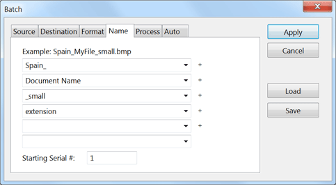 The Name tab sheet lets you rename the saved files with the help of a naming pattern consisting of up to six parts. At the top of the tab sheet you can see how the composed file name will look like for the first image and an example file called "MyFile.bmp".