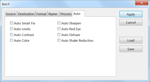 The Auto tab sheet contains eight check boxes for applying automatic image enhancement features. You can find them on the Enhance menu of Photoshop Elements. The Auto Dehaze and Auto Shake Reduction check boxes are only usable in Photoshop Elements 14 and higher. These enhancements are applied at the end after the three actions and the script were executed.