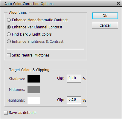 The Auto Options command displays a dialog that offers more options for the Auto Contrast, Auto Level and Auto Color Correction items of the Enhance menu. The Algorithms group lets you switch between them and also offers a Snap Neutral Midtones check box, which produces a slight color correction. The Enhance Brightness & Contrast option is not available in Photoshop Elements yet, but may become available in a future version.