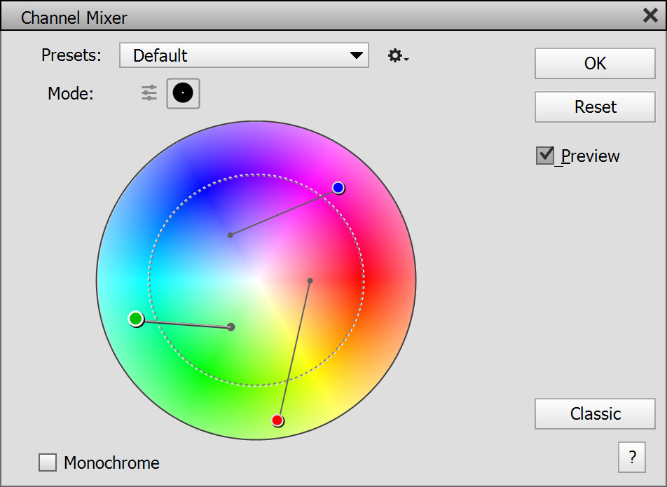 Each angle of the color circle offers a different hue and the distance from the center increases the saturation of the color. If you place a handle outside the dashed circle, it produces a more extreme effect which may involve color casts. The color at the position of each handle is used to calculate the red, green and blue percentages of each output channel. The total value is always 100%, so you cannot change the brightness of the image in the Color Circle mode as you can do in the Default mode. This limits the total amount of effect combinations, but also helps to produce effects faster and easier.