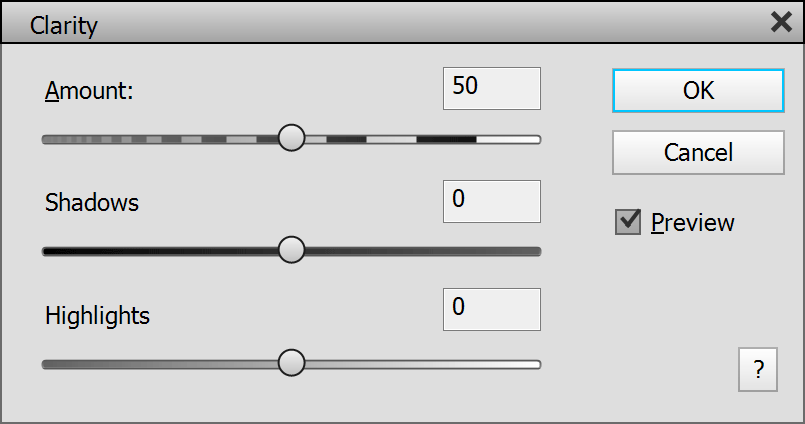 The Clarity filter reproduces the effect that is know from Adobe Camera Raw. It increases the contrast in smaller image details, but more subtle than the Micro Contrast effect. The Amount slider determines the intensity of the effect. The Shadows and Highlights sliders lets you decrease or increase the Clarity effect in the dark and bright image areas.