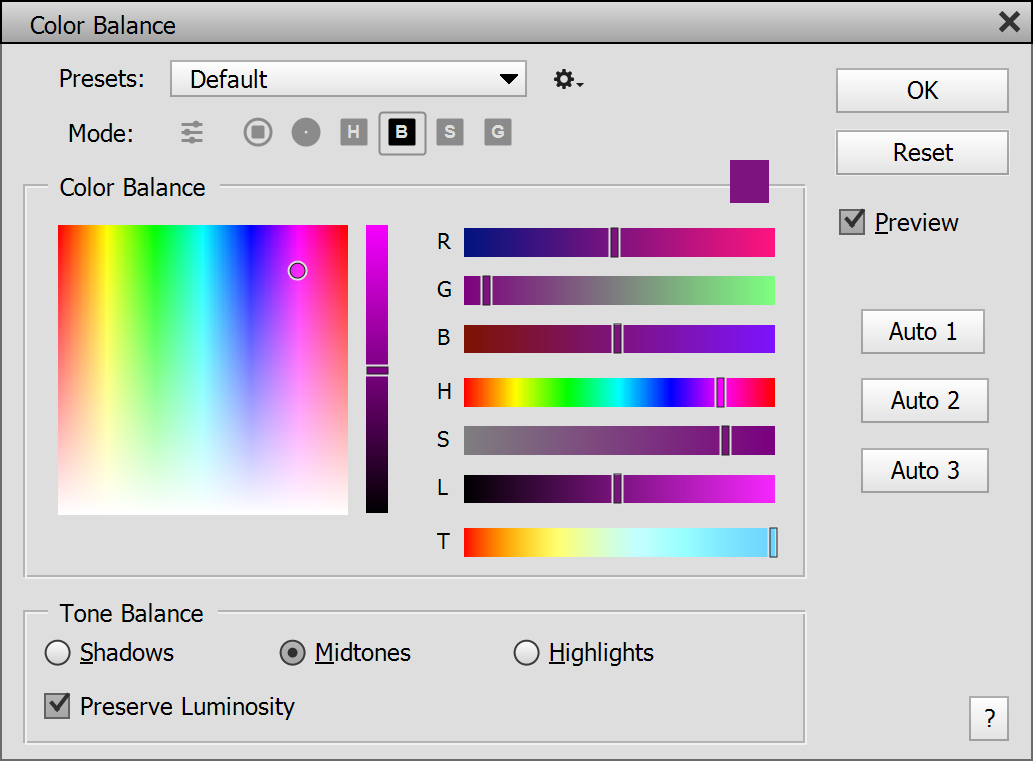 At the bottom in the Tone Balance group you can switch between the Shadows, Midtones or Highlights radio buttons. Each of these 3 options store different values for the three color sliders. So you can apply different colors to the shadows, midtones and highlights at the same time. The Preserve Luminosity check box keeps the brightness of the image unchanged while it is colorized. The Auto 1 to 3 buttons sample the image and adjust the slider in order to remove a color cast. Each button detects color casts differently.