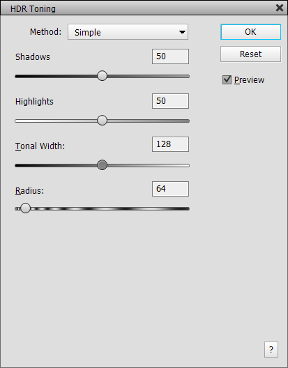 The Lighten Shadows and Darken Highlights sliders of the unexpanded dialog are now called Amount. The Tonal Width sliders define the range of tonal values that will be affected. At the lowest value only the darkest or brightest areas of the image will be changed. Higher slider values also include the midtones.