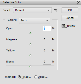 The Color Balance group at the top offers controls for selecting a color that is applied. In the Default mode you can select the color with the help of Cyan/Red, Magenta/Green and Yellow/Blue sliders. At the top right corner of the group box you see a color box, which displays the color that was selected with the three sliders. You can click on this color box to change the color in an appearing color dialog. The sliders then automatically adjust to reflect the new color.
