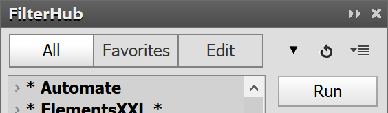 The button bar at the top of FilterHub lets you switch between three views. The All view displays the filters and automation plugins that Photoshop offers whereas the Favorites view contains a list of your favorite filters. The Favorites list is empty, when you run FilterHub for the first time, but you can populate it in Edit view.