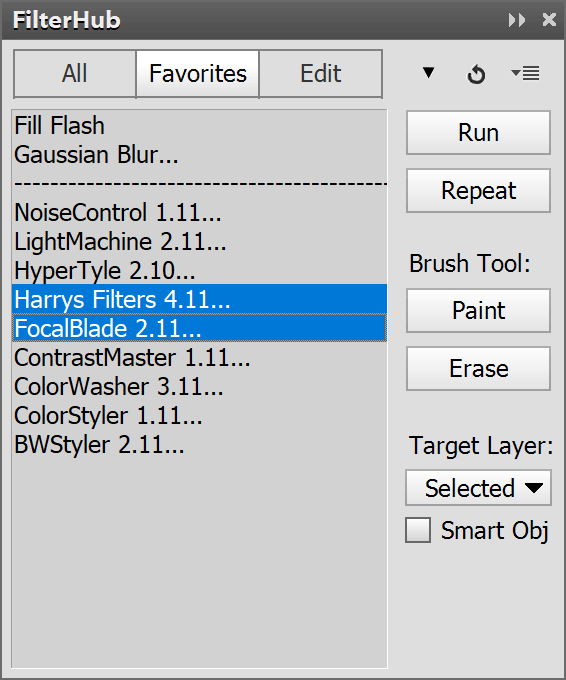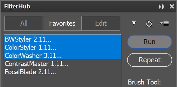 The Favorites view lets you select multiple filters that are executed one after the other. After selecting the filters in the list (by using the Shift or Ctrl key), you have to click the Run, Repeat, Paint or Erase button. As a result the filters are executed beginning with the first one selected at top of the list down to the last selected one at the bottom. If you click the Repeat button it will be done instantly without showing any window. If you click Paint or Erase, all filter windows appear and need to be confirmed before you can start brushing.