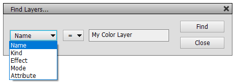 The Find Layers dialog lets you select layers in the Layers panel according to their name, kind, used style effect, blend mode or other attribute. The first combo box on the left lets you select the search type and the third combo box or text box lets you choose or enter a search item. The combo box in the middle defines if the search will look for layers that match (=) the search item or does not match it (!=).