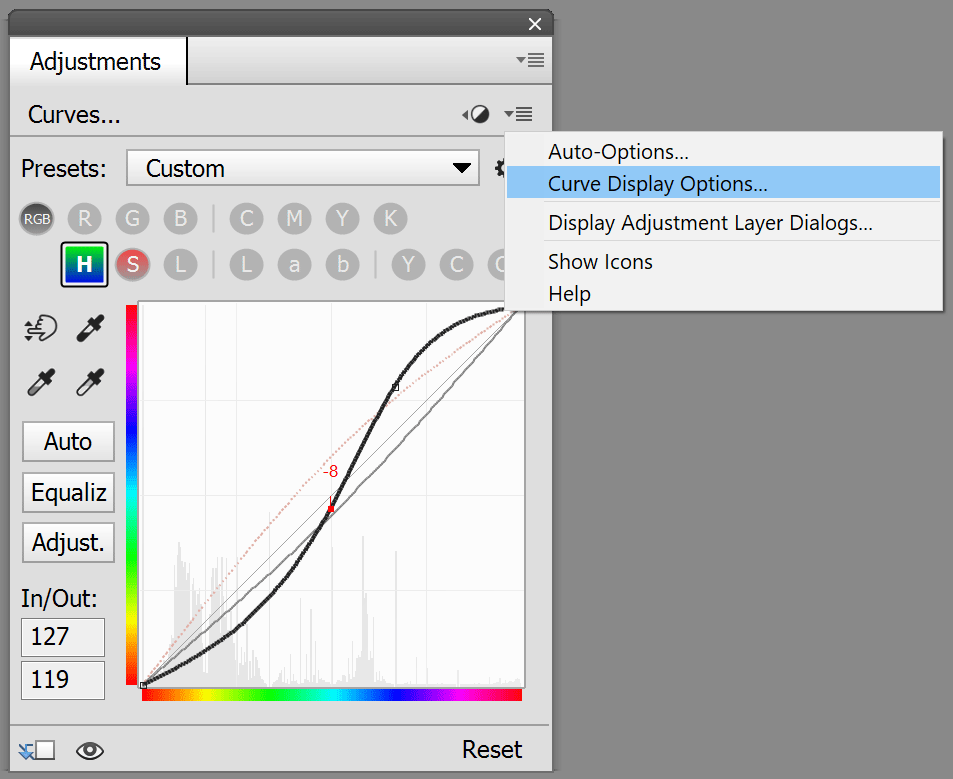All ElementsXXL adjustment layer controls, which are displayed on the Adjustment panel, have two icons in the top right corner. The first icon with the back arrow makes the current controls vanish and displays the icons for adding new adjustment layers again. This way you do not need to click on an image layer to display them again. The second menu icon displays a menu with various items. The Auto Options menu item of Curves adjustment layer displays the Auto Options dialog. The Curve Display Options menu item lets you customize the look of the Curves diagram. The following menu items are available for all ElementsXXL adjustment layers: The Display Adjustment Layer Dialogs menu item lets you activate the ElementsXXL Preference feature of the same name, which makes the adjustment layer controls display in their own dialog and not on the Adjustments panel itself. This can be reversed again in the ElementsXXL Preferences. The Show Icons item has the same purpose as the first icon and shows the icons of all adjustment layers again. The Help menu item displays the appropriate place in the manual similar to the ? button on my dialogs.