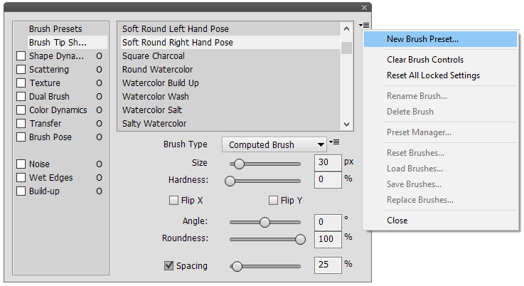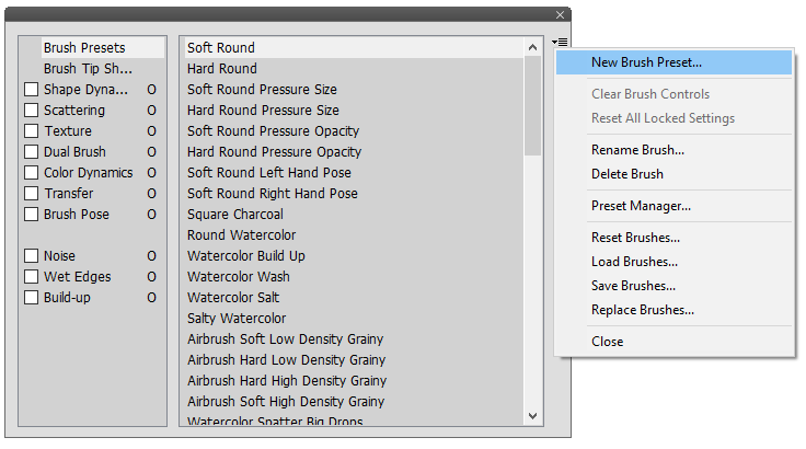 for creating, renaming, deleting, resetting, opening and saving brush presets.