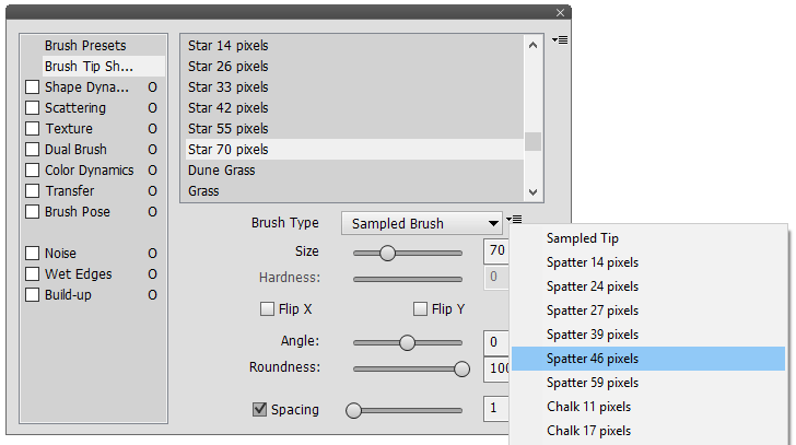 The Brush Tip Shape item displays controls for adjusting the brush tip. The list at the top lets you change the brush tip by selecting a brush preset. Unlike the preset list of the Brush Presets item clicking an item in this list will only change the Brush Tip Shape controls and not all controls of the Brush panel.