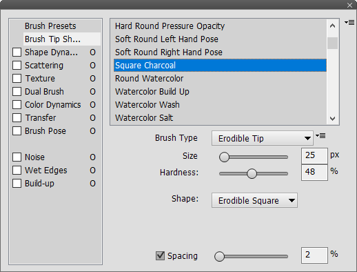 The controls of the erodible tip brush type let you adjust the size, hardness, shape and spacing of the brush tip. You can choose between point, flat, round, square and triangle shapes. These settings are only available in Photoshop Elements 13 and higher.