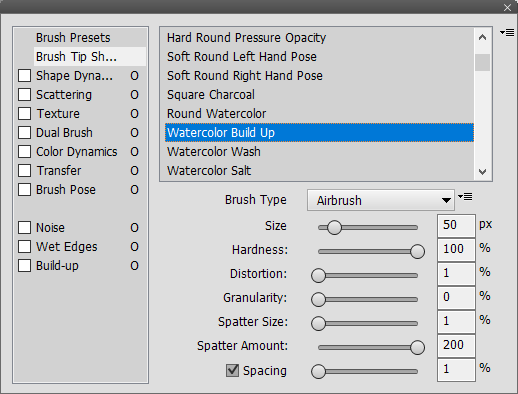 The controls of the airbrush type let you adjust the size, hardness, distortion, granularity, spatter size, spatter amount and spacing of the brush tip. These settings are only available in Photoshop Elements 13 and higher.