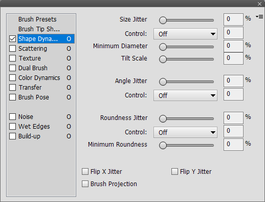 The Brush panel offers a list at the left-hand side, which works similar to tab buttons. Clicking each list item displays new controls and also activates the check box of the item (except for the first two items). You can deactivate these settings again by deactivating the check box of the list item. The "O" letter at the right-hand side of each list item means that its settings are open and not locked. As a result they can be overwritten when clicking on a brush preset. If you click on the "O" it is turned into a crossed out "Ø" sign, which means that the settings are locked and will not be overwritten by a brush preset. The three items at the bottom ("Noise" up to "Built-up") of the list are only check boxes and do not display any other controls. Five tools (Quick Selection, Healing Brush, Smart Brush, Color Replacement and Background Eraser) support limited brush settings, in which case this list is disabled and only the Brush Tip Shape controls are usable.