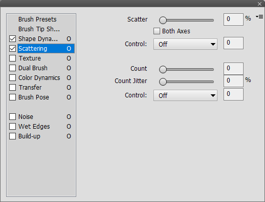 The Count slider fills up the empty spots (where the brush tip did not hit the canvas) produced by the scattering. The higher the Count slider value, the less empty spots remain and the more consistent the brush stroke looks. The Count Jitter determines the randomness of the filling process and the Control combo box controls this process with different options.