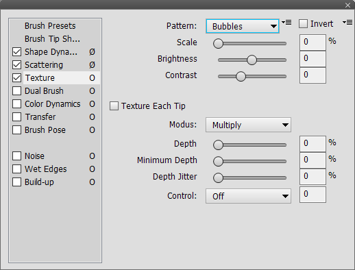 An activated Texture Each Tip check box blend the texture with each tip imprint rather than the whole brush stroke itself. The Mode combo box determines the blend mode that is used to blend the texture with the brush tip. For regular blend modes the Depth slider works like an opacity slider. For the Height and Linear Height modes, it works more or less the opposite way: Lower Depth slider values produce a texture look whereas higher slider values only only vary the brush tip shape.