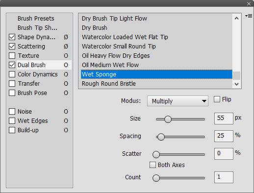 The Dual Brush controls let you define a second brush tip, which is blended