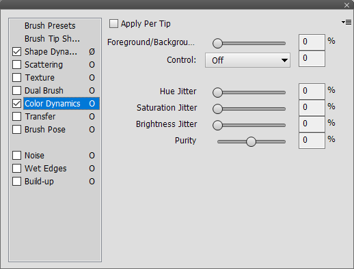The Color Dynamic sheet lets you modify the color of the brush tip. The Apply