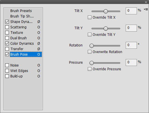 The Brush Pose settings controls allows you to adjust or override the input