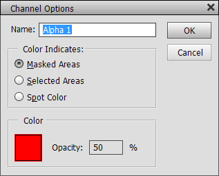 The Channel Options menu item works for all channels except the three color channels. It displays a dialog that provides the similar options as the New Channel dialog above. So you can rename the channel, choose the color and opacity that is used when it is displayed together with the image and decide if this color should cover the masked or selected areas. There is also a Spot Color radio button, but it provides no usable functionality.