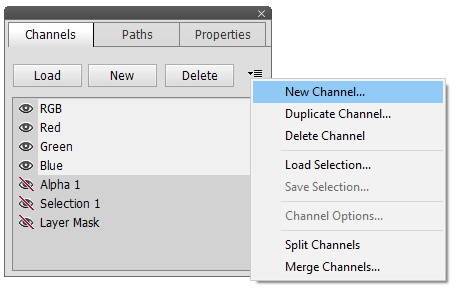 The Load button loads the selected channel as a selection. You can also do the same by holding down the Ctrl key and clicking on a channel or choosing the Load Selection menu item on the panel menu. If a selection exists and an alpha channel is selected, this button shows the Load Selection dialog.