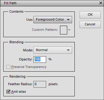 The Fill Path dialog offers various parameters. You can choose a color or pattern, blending mode, opacity, feathering and anti-alias of the filling operation.