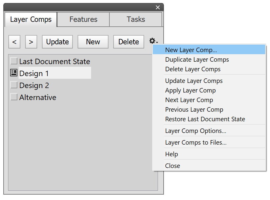 The existing layer comps are displayed in a list box on the Layer Comps panel. Above it there are five buttons as well as a menu icon that displays a menu with further commands. You can also display the same menu as a context menu by right clicking on one of the layer comp items in the list box.