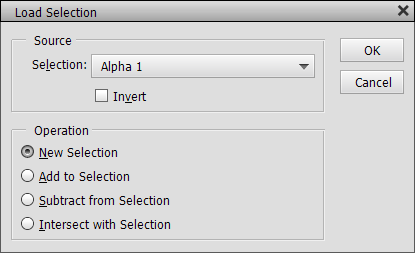 The Load Selection menu item on the panel menu (as well as Select > Load Selection) displays a dialog. On this dialog you can choose the alpha channel that you want to load as a selection from the Selection combo box. The Invert check box inverts the selection in the process. If a selection is already present, you can choose to replace it by keeping the New Selection radio button active. But you can also decide to change the current selection by adding the alpha channel to it (Add to Selection), subtracting the alpha channel (Subtract from Selection) or intersecting both (Intersect with Selection).