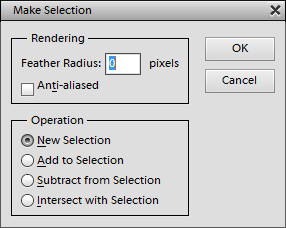 The Make Selection command creates a selection from the current path and also allows combining the current selection with the path. Additionally you can feather and anti-alias the selection. The New Selection option simply replaces the existing selection with the selection that is created from the path. The Add to Selection option extends the existing selection with the path, the Subtract from Selection option contracts the existing selection and the Intersect with Selection option only keeps the intersection areas of the path and selection.