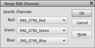 The Merge Channels menu item displays two dialogs in succession. In the first please choose "RGB Color" from the Mode combo box. The other options do not make much sense. Also make sure that Channels is set to 3. After clicking OK, you need to specify the document names that contain the red, green and blue channels in the new dialog. Usually they are already automatically selected, so you only need to click OK. As a result the three grayscale documents are combined to a new RGB document.
