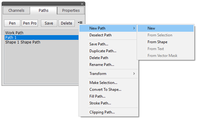 The New item of the New Path sub menu creates an path item on the list, which does not contain any path. Use the pen tool to create a path for this new item. If a selection is available, you can use From Selection to create a new path from it. The same is true for the From Shape, From Text and From Vector Mask menu items: If a shape layer, text layer or layer with a vector mask is currently selected in the Layers panel, then each menu item creates a new path from the shape, text or vector mask.