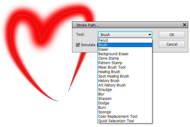 The Stroke Path dialog lets you select the tool that will be used for stroking as well as activate a Simulate Pressure check box for more irregular stroke. The stroke is drawn according to the tool options of the selected tool. So before using the Stroke Path command it is a good idea to select the tool that you want to use and adjust its settings on the Tool Options bar in order to achieve the stroke you had in mind.