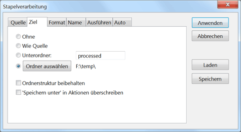 Die Option Wie Quelle speichert die bearbeiteten Bilder im gleichen Ordner, was bedeutet, dass sie überschrieben werden, sofern Sie nicht ein anderes Dateiformat und einen anderen Namen in den nächsten beiden Registerkarten wählen. Die Option Unterordner ermöglicht Ihnen, den Namen eines Unterordners im Textfeld daneben einzugeben. Dadurch werden die bearbeiteten Bilder in einem Unterordner diesen Namesn am Ursprungsort der Bilddateien gespeichert. Beide Optionen funktionieren nicht, wenn Sie ein geöffnetes Bild bearbeiten, das mit Datei > Neues Bild erstellt und noch nicht gespeichert wurde, da es keinen Dateiort hat, wo es gespeichert werden kann.