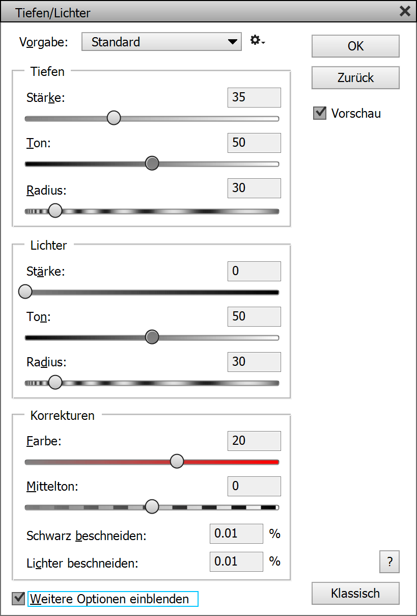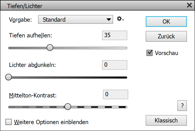 Unter Bearbeiten > Einstellungen > ElementsXXL können Sie das Kästchen Tiefen/Lichter aktivieren, um den klassischen Dialog von vornherein anzuzeigen. Standardmäßig wird eine Vorschaubild erzeugt, um die Effektberechnung zu beschleunigen. Falls Sie das nicht möchten, können Sie dort das Kästchen Vorschaubild für Filter verwenden deaktivieren.