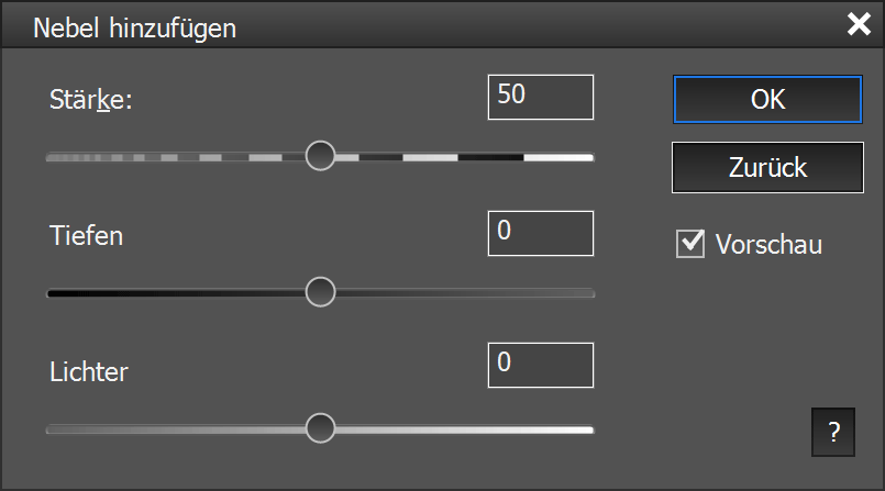 Der Filter Nebel hinzufügen reproduziert den aus Adobe Camera Raw bekannten Dunsteffekt. Es verringert den Kontrast und fügt dem Bild einen nebligen Look hinzu. Der Stärke-Regler bestimmt die Intensität des Effekts. Mit den Reglern für Tiefen und Lichter können Sie den Effekt in den dunklen und hellen Bildbereichen verringern oder verstärken.