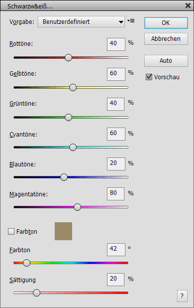 Die sechs oberen Regler definieren den Schwarzweißeffekt des Filters, indem sechs verschiedene Farbkanäle gemischt werden, die auf dem RGB- und dem CMY-Farbmodell basieren. Ein niedriger Reglerwert verdunkelt den entsprechenden Farbbereich und ein hoher Wert hellt die Farbe in der Schwarzweiß-Version des Bildes auf. Die Auto-Schaltfläche setzt Werte für diese Regler, was in vielen Fällen ein optimales Schwarzweißergebnis zur Folge hat. Um den Schwarzweißeffekt einzufärben, aktivieren Sie das Farbton-Kästchen. Nun können Sie auf die Farbbox klicken, um eine andere Farbe aus einem Farbdialog zu wählen, oder verwenden Sie die Farbton- und Sättigung-Regler, um die Farbe anzupassen.