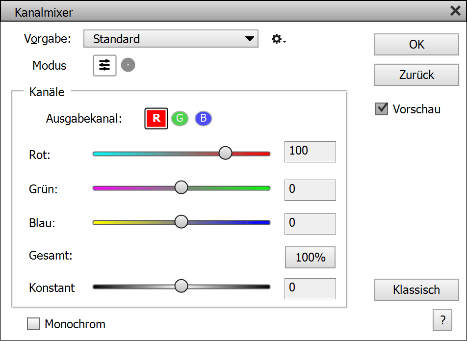 Die Ausgabekanal-Option im Standardmodus wählt den Farbkanal, der von den vier Reglern bearbeitet wird. Jede Ausgabekanal-Option besitzt unterschiedliche Reglerwerte, so dass es tatsächlich insgesamt 3 x 4 = 12 Reglerwerte gibt. Die Rot-, Grün- und Blau-Regler legen die Farbmischung fest, die für den ausgewählten Ausgabekanal verwendet wird. So lange der Gesamtwert aller drei Regler sich bei 100% befindet, bleibt die Helligkeit unverändert. Der Konstant-Regler passt die Helligkeit des aktuellen Ausgabekanals an.