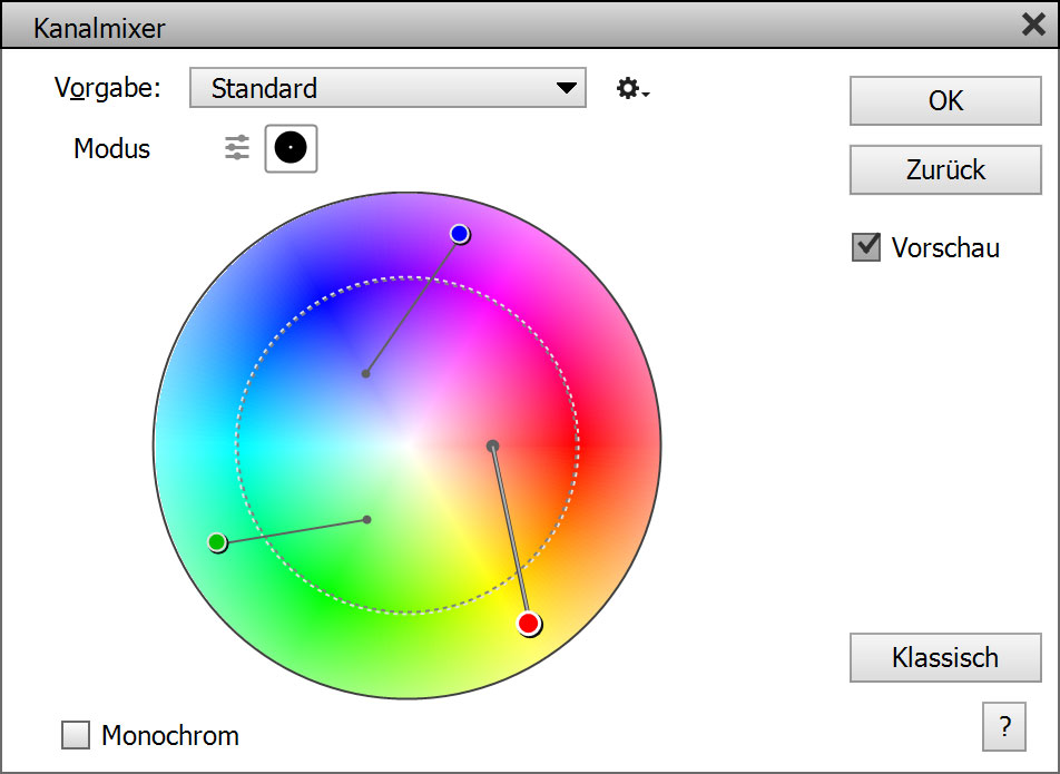 Jeder Winkel des Farbkreises bietet einen anderen Farbton und die Sättigung erhöht sich mit Abstand zum weißen Zentrum. Wenn Sie einen Kontrollpunkt außerhalb des gestrichelten Kreises platzieren, wird ein extremerer Effekt erzielt, der zu Farbstichen führen kann. Die Farbe an der Position jedes Kontrollpunkts wird verwendet, um die Prozentwerte für jeden Ausgabekanals zu berechnen. Der Gesamtwert beträgt immer 100%, so dass Sie die Helligkeit des Bildes im Farbkreismodus (anders als im Standardmodus) nicht ändern können. Dies begrenzt die Gesamtzahl der Effektkombinationen, hilft aber auch, bestimmte Effekte schneller und einfacher zu produzieren.