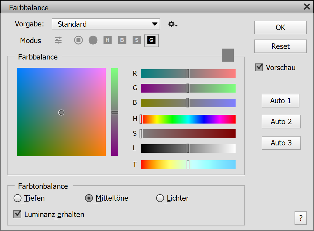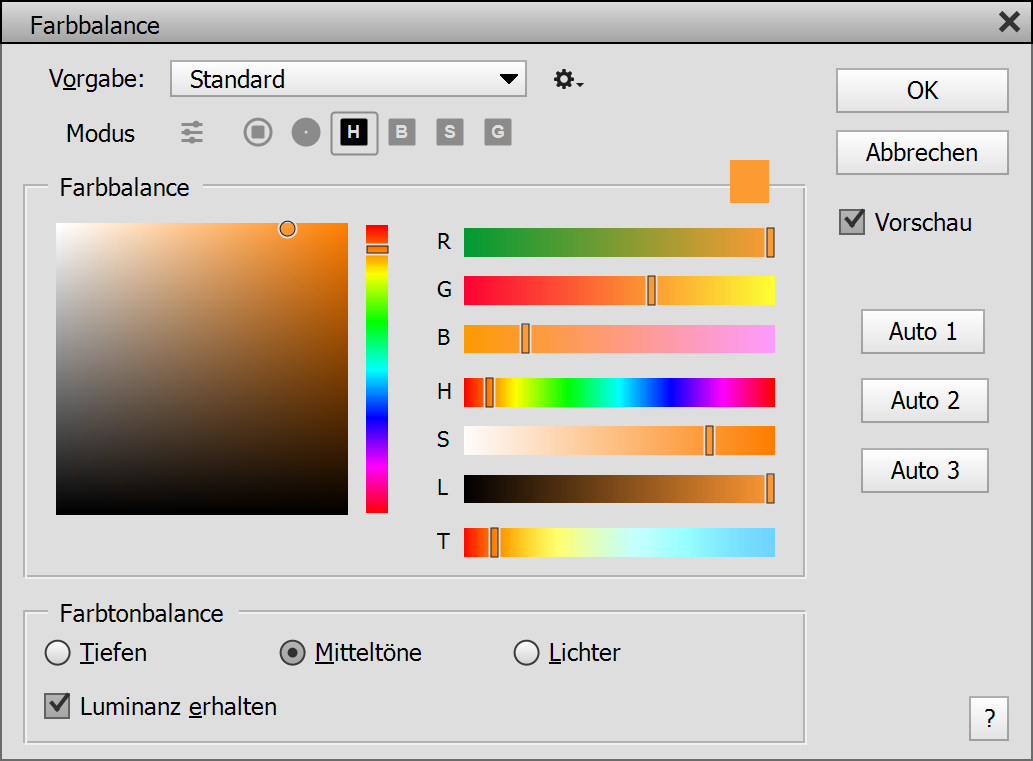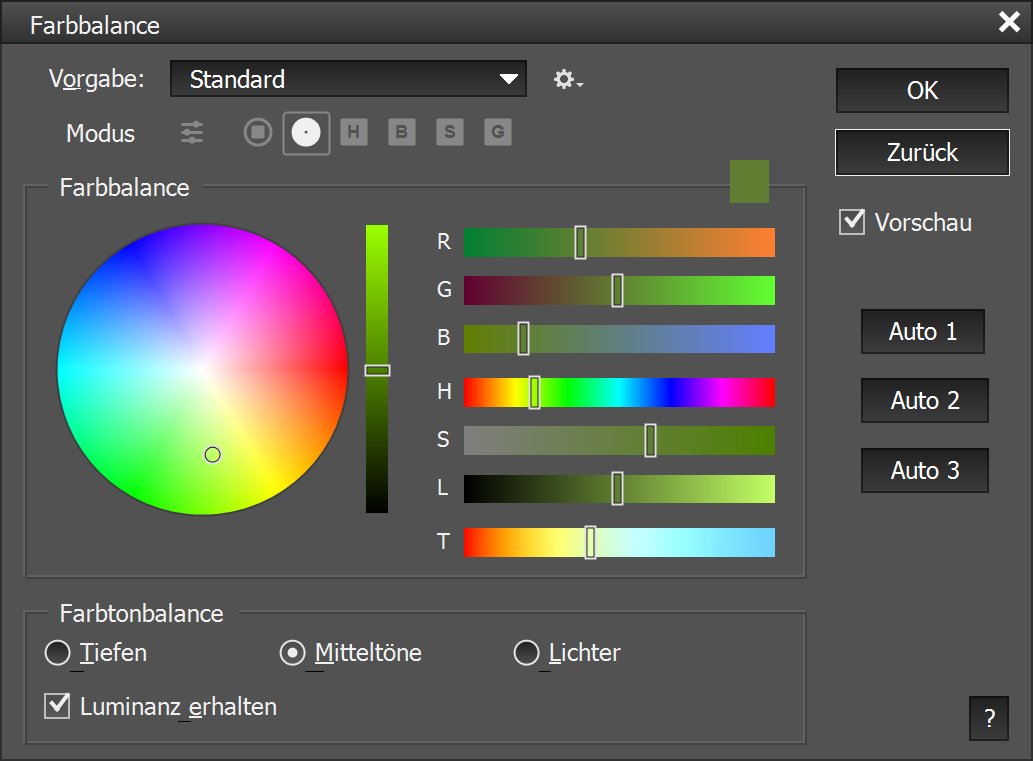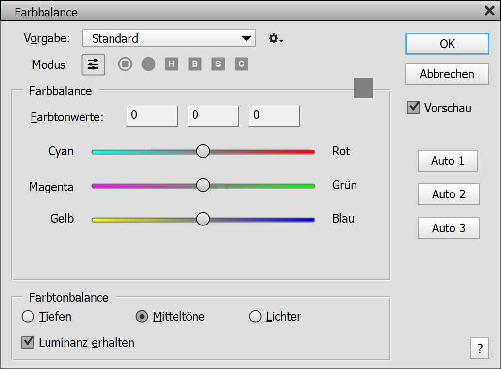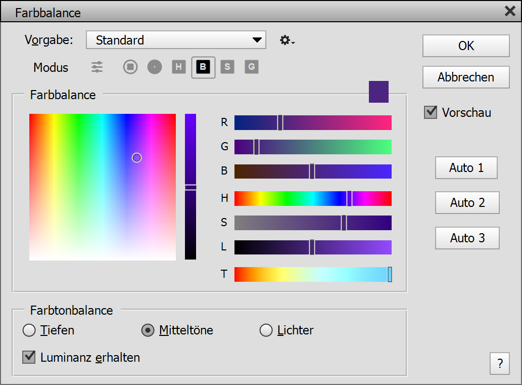 Um einen bestimmten tonalen Bereich auszuwählen, klicken Sie entweder auf die Schatten-, Mitteltöne- oder Lichter-Optionsschaltfläche unten in der Farbtonbalance-Gruppe. Jede dieser Optionen erlaubt verschiedene Werte für die drei Farbregler. So können Sie Schatten, Mitteltönen und Lichtern gleichzeitig unterschiedliche Farben zuweisen. Das Kästchen Luminanz erhalten belässt die Helligkeit des Bildes während es eingefärbt wird. Die Schaltflächen Auto 1 bis 3 untersuchen das Bild ab und passen den Regler an, um einen Farbstich zu entfernen. Jede Schaltfläche erkennt Farbstiche anders.