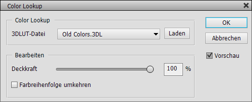 Der Deckkraft-Regler ermöglicht Ihnen, die Intensität des Color-Lookup-Effekts zu reduzieren. Im Fall der Color-Lookup-Einstellungsebene reduziert dieser direkt die Deckkraft der Einstellungsebene. Der Deckkraft-Regler ist nicht immer verfügbar, dies hängt von der benutzten Version von Photoshop Elements ab und ob Sie den Filter- oder Einstellungsebenendialog verwenden. Alternativ verwenden Sie bitte den Bearbeiten > Verblassen Befehl, nachdem Sie den Color Lookup Filter angewendet haben, oder verändern Sie die Ebenendeckkraft, nachdem Sie die Color-Lookup-Einstellungsebene angewendet haben.