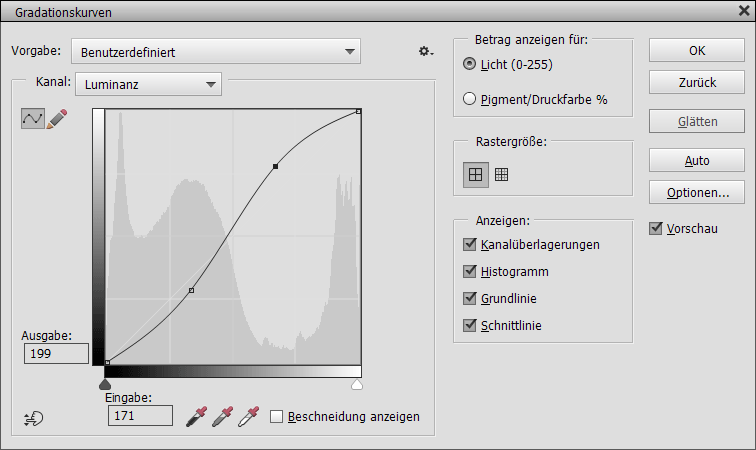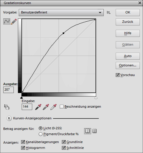 Die schwarze RGB Kurve zeigt eine typische Kontrastanpassung mit Hilfe einer