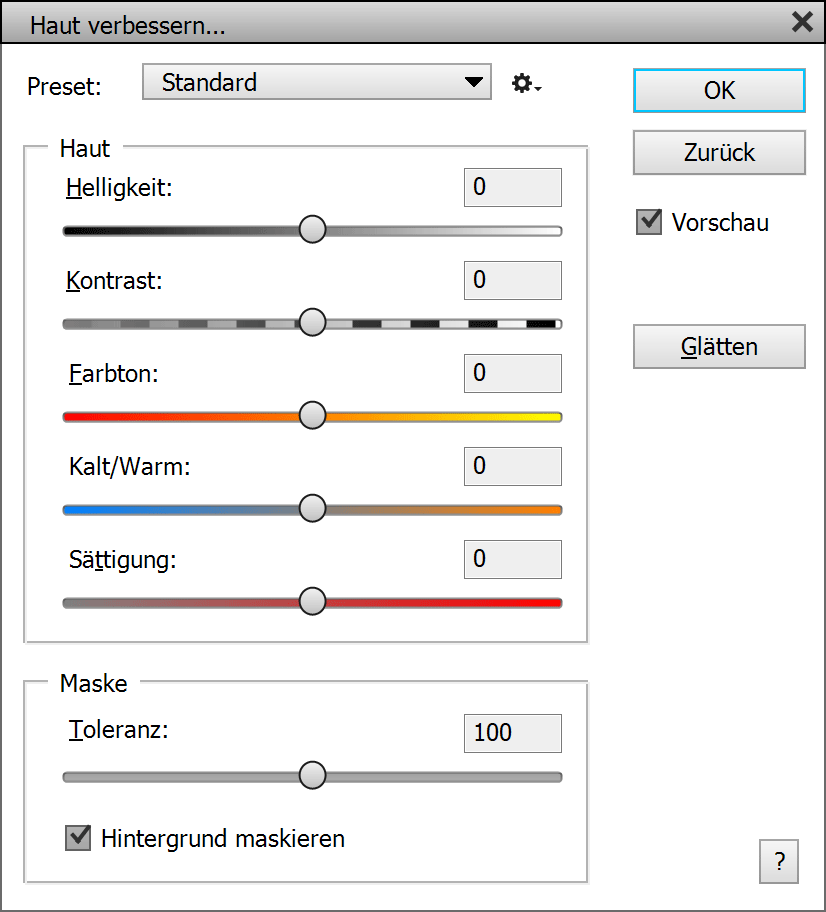 In der Maskengruppe können Sie die Hautmaske anpassen, die vom Filter automatisch erstellt wird. Mit dem Toleranz-Regler können Sie zur Maske, welche die Hautbereiche definiert, mehr oder weniger Bildbereiche hinzufügen. In Photoshop Elements 2020 und höher können Sie auch das Kästchen Hintergrund maskieren verwenden, um zu verhindern, dass Hintergrundbereiche mit einer ähnlichen Farbe wie die Haut geglättet werden.